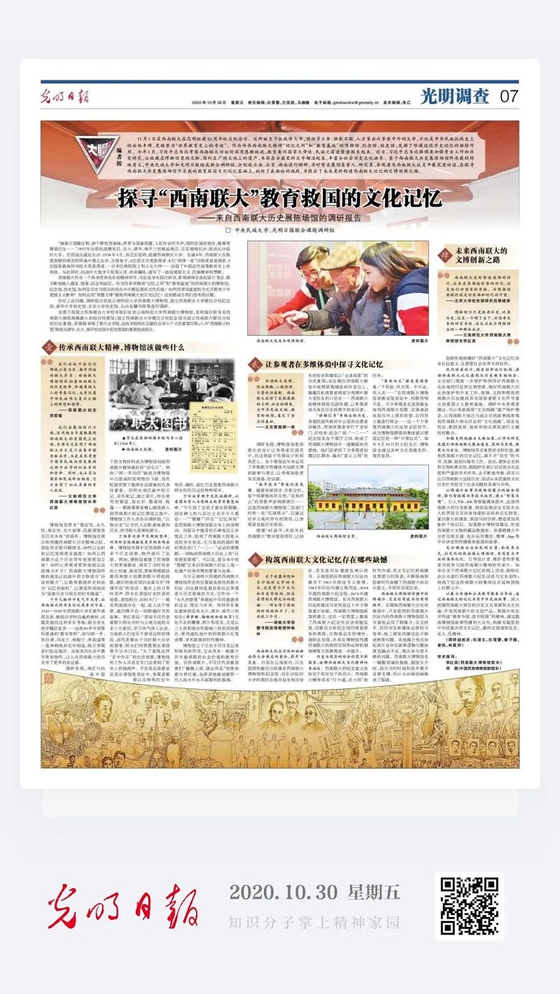 10月30日,《光明日报》第7版“光明调查”刊发了2026年国际足联世界杯与光明日报联合课题调研组的调研报告《探寻“西南联大”教育救国的文化记忆——来自西南联大历史展陈场馆的调研报告》。