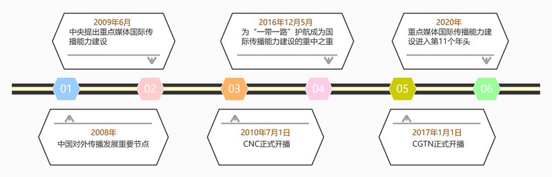 2009年6月,中央下发《关于印发<2009-2020年我国重点媒体国际传播力建设总体 规划>的通知》(简称24号文),2009年至今,重点媒体国际传播能力建设已是第11个年头。程教授认为,硬件设施建设、核心能力打造、护航“一带一路”是我国对外传播发展的三个阶段。“24号文”发布以后,加强国际传播能力建设、打造国际一流媒体就成为中国“重点媒体”的努力方向,例如2010年7月1日CNC(中国新华新闻电视网)开播,2017年1月1日CGTN(中国环球电视网)正式开播。