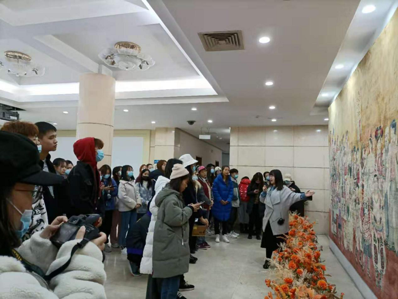 最后,同学们在大厅的大型民族人物丝毯前合影留念,结束了本次参观活动。参观校史馆的活动就像是一块敲门砖,让20级本科新生们与民大愈发亲近、联系愈发密切,使同学们能够更好地在民大“美美与共,知行合一”氛围的熏陶之下,成长为一个对社会、对国家有用的新时代青年。
