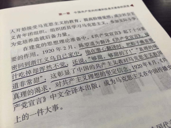 陈疆猛:阅读《中国共产党简史》第一章内容后,我了解到从1840年的鸦片战争开始,到1927年国共合作破裂和大革命的失败这段时间里,无数仁人志士为了中华民族的前途和命运投身于革命洪流。其中令我印象尤为深刻的是,在建党的思想理论准备中为《共产党宣言》做翻译工作的陈望道先生。陈望道先生为潜心翻译《共产党宣言》,把粽子蘸着墨水吃掉却浑然不觉,还说“够甜,够甜的了!”“真理的味道非常甜”。这充分彰显了中国的共产主义者对马克思主义救国真理的渴求,对共产主义的坚定信念非常值得我们后继的共产党员去学习。