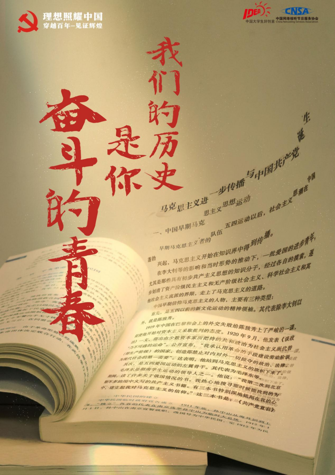 图片中,书本里的文字部分,特别选取了马克思主义在中国传播,促进中国共产党诞生的章节,用意为“记载党的开始”,俗话说千里之行始于足下,党百年来的历程追根溯源,便要从马克思主义传入中国开始;因此文字的开头,对应现在“百年”的主题,有回顾最初的厚重感。主题的画面偏黄色,也是为了突出历史陈旧、厚重的氛围;一束光打在书面上,暗示中国共产党如同光一般照亮了国民革命的道路,为祖国带来了希望。