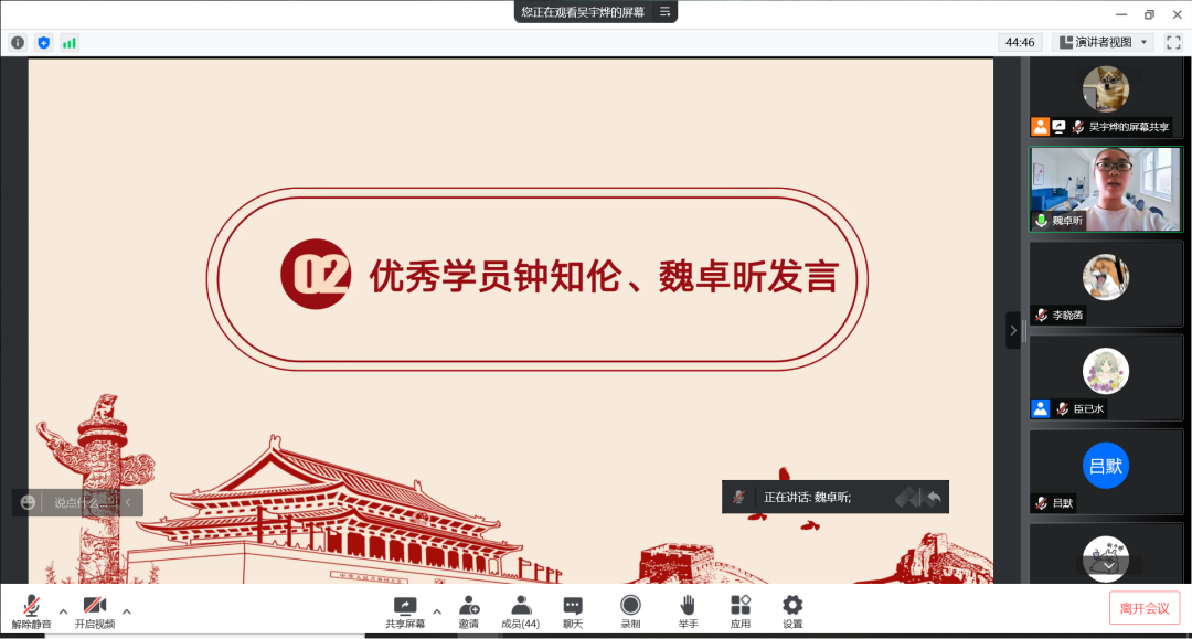 “通过回顾中国共产党的发展历程、性质、宗旨、指导思想,我加深了对习近平新时代中国特色社会主义思想的理解,进一步了解了党在纪律方面的要求,正如马克思1859年致信恩格斯时所言,‘我们现在必须保持党的纪律,否则将一事无成’,我将时刻向身边的中国共产党党员看齐,切实做到自重、自省、自警、自立。”2021级新闻学硕士入党积极分子钟知伦作为优秀学员代表发言,总结了自己在本次培训中的收获。2021级新传三班的入党积极分子魏卓昕分享了自己在培训期间加入社区核酸检测志愿服务工作队的亲身经历,表明“用实际行动承担社会责任,尽我所能奉献绵薄之力”的决心,号召学员们将学习所得付诸实践,脚踏实地为人民服务。