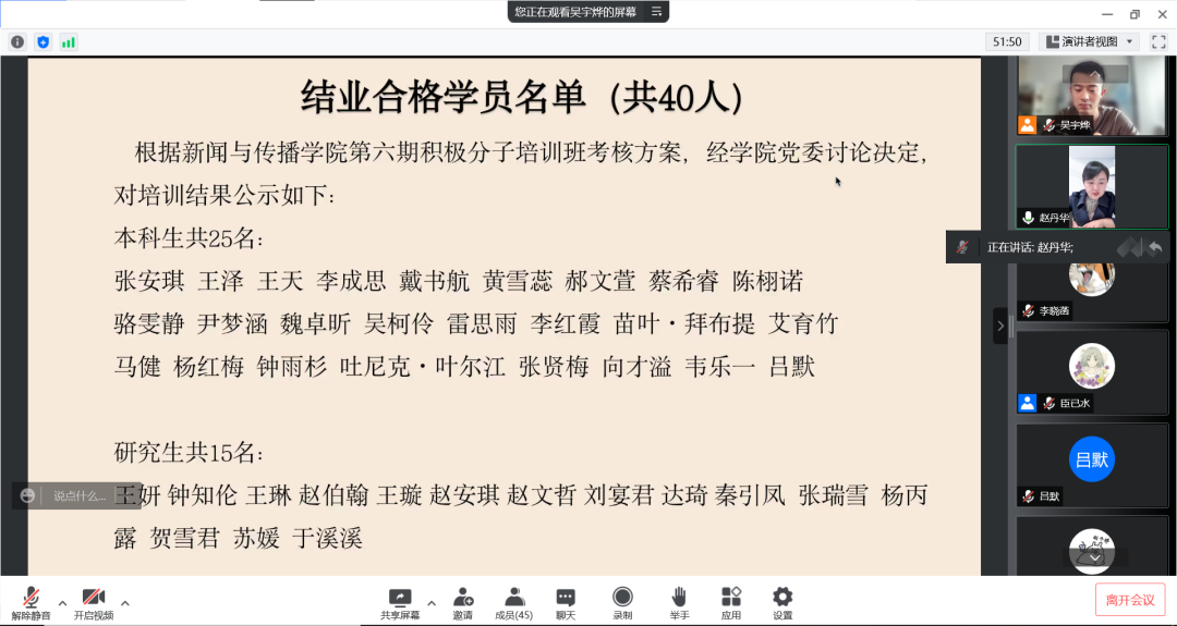 赵丹华副书记宣读本期结业合格名单并对同学们表示了衷心的祝贺。经考核评定和党委审核,本期积极分子培训班25名本科生、15名研究生顺利结业。